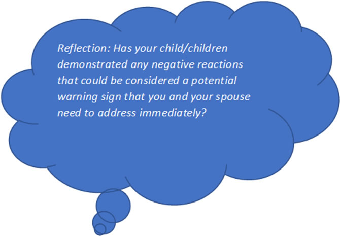 Young children will often struggle to be loyal to both parents. This struggle might be expressed in many ways; it may take the form of trying to over please parents and be perfect. On the other hand, it might be expressed through anger toward one or both parents. Keep in mind that a range of reactions is possible. You will probably be challenged by your children’s reactions because you don’t want to see them hurt, which will increase your own stress level. Remind yourself that these responses are normal, and in time you should see a great improvement. Allow yourself to notice times when your child is coping well with the situation. Let them know you notice their efforts and are proud of them.